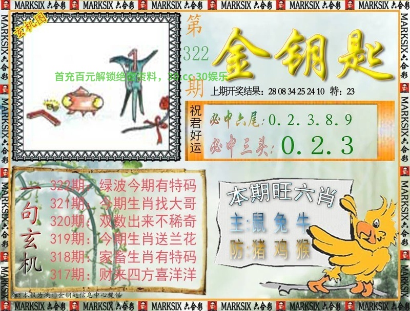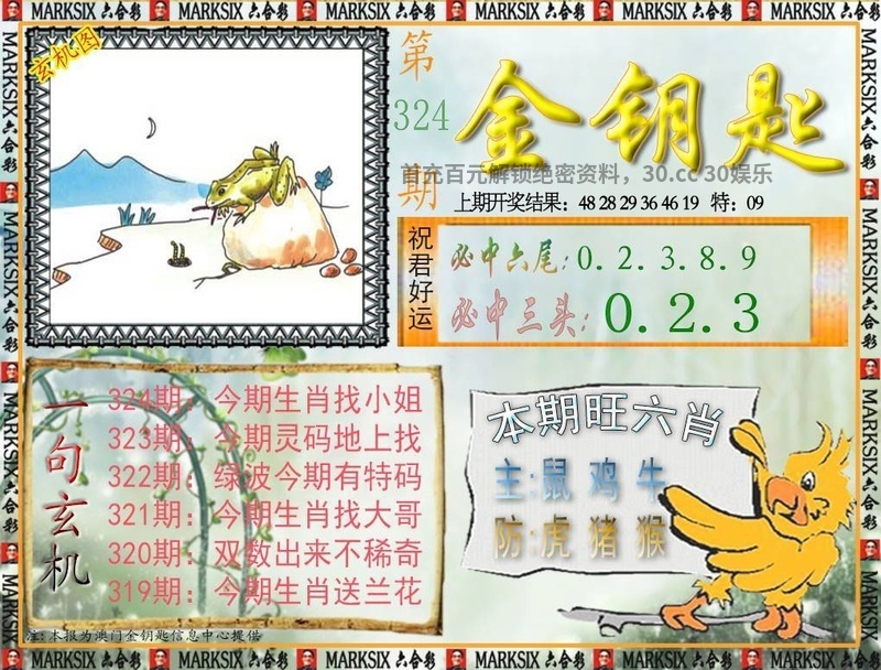 319期一字記曰:【奔】 为口奔驰,为势所逼,羽翼未丰也抢食。一分收获,十分努力,适者生存要积极。 玄机测字《注》 解:含桃庄主后园深:后园深解后肖狗鸡猴猪马羊。 综合取肖:狗鸡猴猪马羊 |